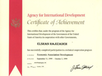 «Peşəkar iqtisadi assosiyasiyaların infişafı sahəsində texniki əməkdaşlıq proramı» seminarı. ABŞ-ın Beynəlxalq İnkişaf Agentliyi. (USAID) və Təhsilin inkişafı Akademiyası (AED). Vaşiqton: 11 sentyabr - 2 oktyabr 1999-cu il. Sertifikat - AED/Washington, DC. 2 oktyabr 1999-cu il.