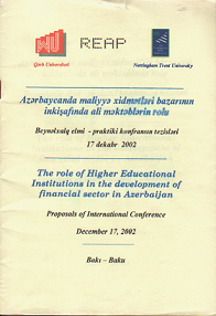 46.Müstəqil vergi konsultantlarnın hazırlanması və treninqi problemləri. Аzərbayсanda maliyyə xidmətləri bazarının inkişafında ali məktəblərin rolu. Beynəlxalq elmi-praktiki konfrans. Bakı: İngiltərənin Nottinqem Trent Universiteti və Qərb Universiteti. 2002. 0,1 ç.v.