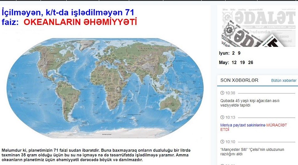 On June 8, World Oceans Day Adalet.az the website has published an article, and the information provided by the Azerbaijani economist, doctor of Economic Sciences, professor Elshan Hajizade about the oceans is widely given here.